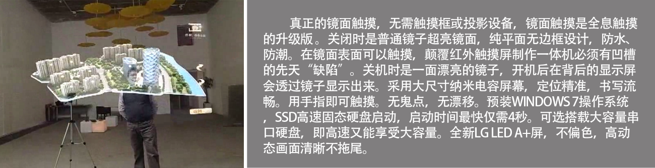远远看起来明明是一面镜子,但是走进之后,突然间,镜子居然开始出现图像和文字,用手触摸,还会随心意自由转换画面。神奇的效果,意外的心理,挑逗内心的好奇。这到底是什么高科技?