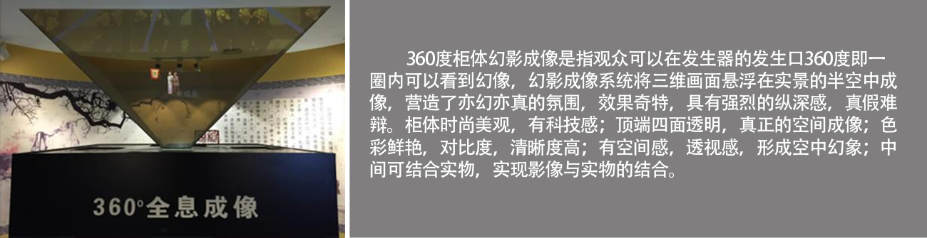 360度柜体幻影成像是指观众可以在发生器的发生口360度即一圈内可以看到幻像,幻影成像系统将三维画面悬浮在实景的半空中成像,营造了亦幻亦真的氛围,效果奇特,具有强烈的纵深感,真假难辩。